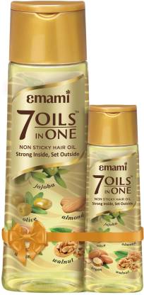 • Emami hair oil is the best in class 7 oil in one that enriched with almond oil, olive oil, coconut oil, jojoba oil, argan oil, amla oil, and walnut oil. Its formulated to efficiently repair thin and damaged hair and optimizes the natural oil balance of hair and scalp. It helps to improve the heir affected by aging, pollution, sun exposure, and chemically treatment. The Emami oil adds natural thickness and volume to your heir and provides protection and also provides your hair to stay strong and glossy.