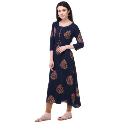 GLAM ROOTS women’s gold print rayon flared kurta looks classy and perfect for daily office, college, and occasional wear. This rayon flared kurta is made up of cotton fabric with a round neck. If you want to buy the best navy blue striped asymmetrical cotton dress at a better price then this is the best option for you. So, don’t delay and get this dress at a special price.