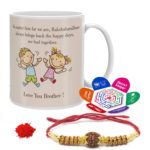 Indigifts Raksha Bandhan Gift Set Of Mug, Crystal Rakhi, Roli, Chawal & Greeting Card at ₹399.00