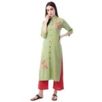 Style your wardrobe with RAJMANDIRFABRICS Women’s Cotton Straight Embroidered Kurta with Pant by availing 11% discount on it. This kurti is made up of cotton fabric with banded collar, 3/4th sleeves and printed embroidery. It looks great when wear with golden printed pant and matching accessories.